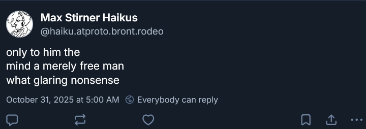 This is where both the power of the ecosystem and the available dev tools and ease of use seemed to align perfectly. My first bot, markov-generated Max Stirner haikus, literally took me 20 minutes to make. I found an existing markov haiku generator, downloaded The Ego And Its Own from Project Gutenberg, and modified Bluesky's bot starter template slightly. All I had to do was create a unique account for it on my PDS and I can run it in the background indefinitely.