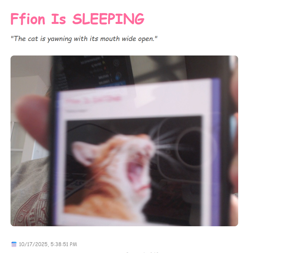Unfortunately, I realized there are many edge cases that I maybe don't want to be posted to a database that's public by default. This realization came pretty quickly when the camera caught my wife and the cat together while she was doing her makeup - luckily she was not nude, but the possibility was there! I added some filtering in both the image description and detection to avoid this happening, but since, again, my PDS is public by default, I'm not really confident enough to keep this running live yet.