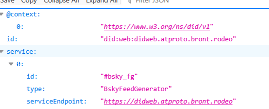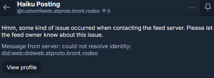 atproto.bront.rodeo/haikus) but even running my server at that path and redefining my.well-known/did.jsonto use it as an endpoint didn't solve it, so I'm running it from thedidwebsubdomain. - Again, the lack of devtools is frustrating here: the only way to test what my feed actually looks like is publishing it live. It would be really nice to have some local wrapper to display the feed before you publish. Backfilling a feed is also not super well-documented - obviously people have figured out how to do it, but it seems like something that should be a default option and not monkeypatched by users.