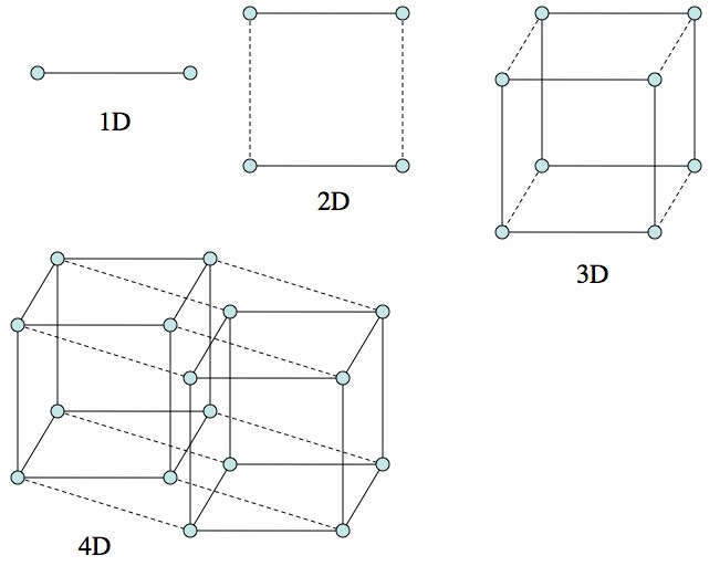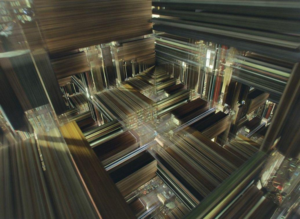 He enters a tesseract - a four-dimensional structure constructed by the aliens or advanced humans. Even this, right, is a great illustration of a four-dimensional object: it's infinite copies of his daughter's bedroom laid out across the time plane. But then he does fucking magic. He sends a signal across time to help his daughter solve for X or whatever to save humanity, and he does so with the power of love. The thesis of the film ends up being that love itself is a physical force that can transcend dimensions. It's Cooper's emotional connection to his daughter that allows him to find her in spacetime.