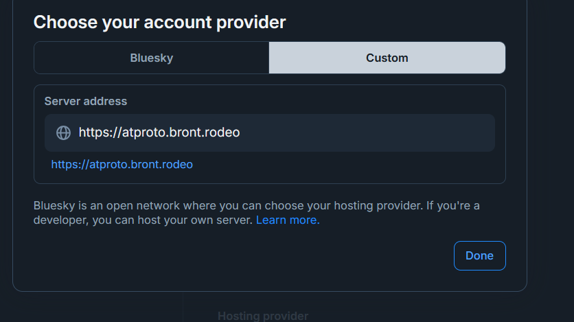 The annoying part of this is that currently atproto only offers support for Caddy, while my existing server runs on nginx. Rather than adding yet another thing to figure out, I just spun up a new server - I can spare the $4 for the time being. I then set up forwarding on my bront.rodeo