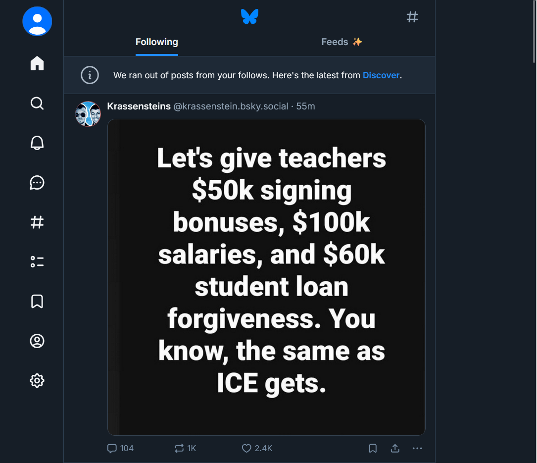 Naturally the first suggested post is from the Krassensteins. Bluesky gonna bluesky, I guess. I set up a simple profile and made my first post: