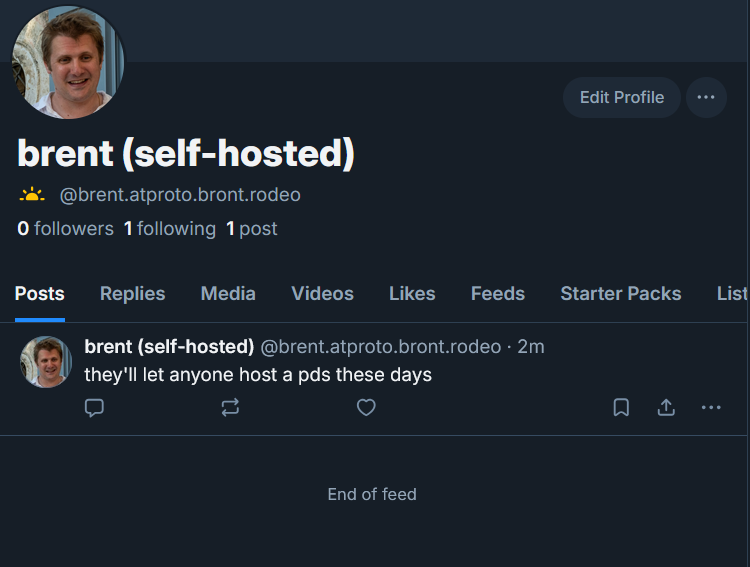 for my DNS and a personal email as an admin email and set up a new user with the handle brent.atproto.bront.rodeo