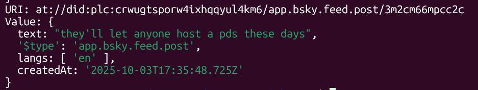 And, if I'm not misunderstanding something, I am able to access my Bluesky posts directly from my PDS's open API, which again, I set up in about ten minutes. This is astonishing! So astonishing that I'm still suspicious of it and am waiting for the other shoe to drop.