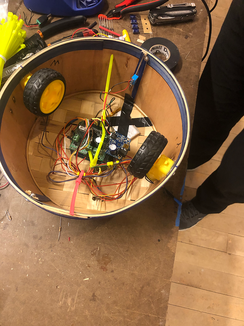 You can check out the final code here. Basically, the arduino takes input from 3 light-dependent resistors and chooses to move forward, left, right, or remain where it is based on which LDR is receiving the most light — we used a simpleKalmanFilter to normalize these values since the LDRs are prone to fluctuation. While we’d initially hoped to run the timing circuit based on a 5–5–5 timer, we ended up having to use AdaFruit’s SleepyDog library to initiate a sleep mode while the battery charges — this has a power draw of about 4 microamps on a 3.3V power source, which is pretty negligible. As it stands, at an interval of N (for testing we’re using 10 seconds, but in ideal conditions it would happen every few seconds), the arduino powers on, activates the motor, and chases the light for 10 seconds, then goes back into sleep mode. This process involved a lot of tweaking for speed and light input — as you can see from some of the videos, it would initially move more than it needed to or over-turn, and the LDRs gave out inconsistent values even with the SimpleKalmanFilter.